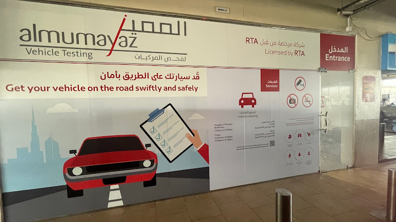 Service available at Al Mumayaz Vehicle Testing – Barsha Mall Branch and Al Mizhar Branch.
